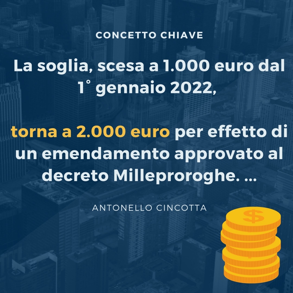 L’attuale limite di 2000€ scenderà a 1000€ anzi no resterà cosi per tutto il 2022.